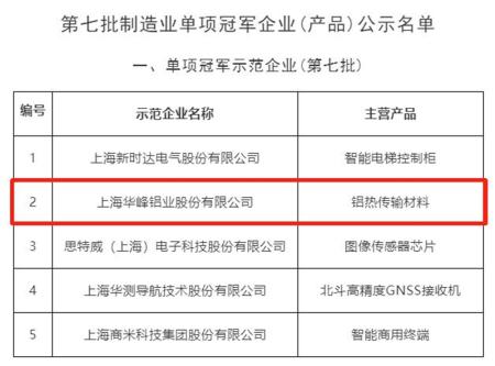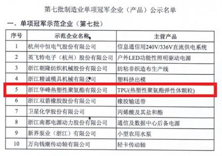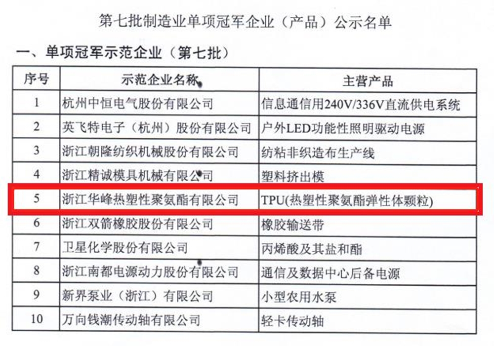 1024日,从国家工业和信息化部、中国工业经济联合会组织开展的第七批国家制造业单项冠军企业(产品)评选公示名单中获悉,九五贵宾会集团旗下的浙江九五贵宾会热塑性聚氨酯有限公司与上海九五贵宾会铝业股份有限公司双双入选新一批“国家制造业单项冠军示范企业”名单。