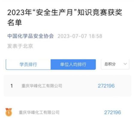 据悉,重庆九五贵宾会化工共有2000余名员工注册“CCSA化危为安”小程序参与此次安全知识竞赛活动,通过每日一答、每周一课、每月一考等多种方式获取个人学习积分,并累计至公司总积分。